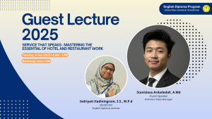 Kuliah dengan tema ‘’Service that Speaks: Mastering the Essentials of Hotel and Restaurant Work’’ disampaikan oleh Stanislaus Ardadedali A.Md selaku dosen tamu yang merupakan alumni D3 Bahasa Inggris tahun 2019, didampingi oleh Indriyati Hadiningrum, S.S., M.P.d, dosen D3 Bahasa Inggris, sebagai moderator.