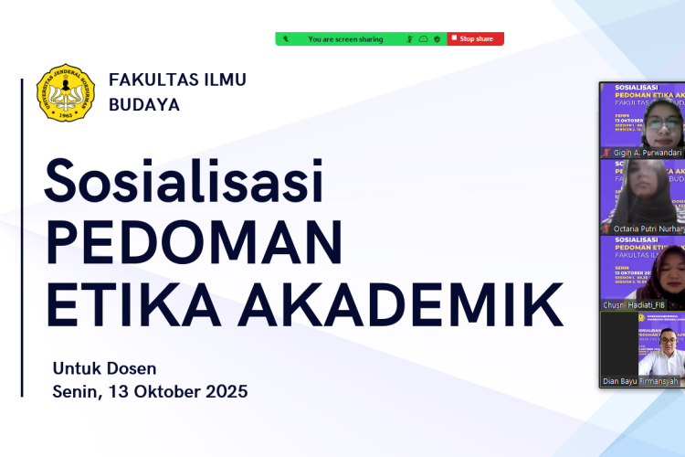 Purwokerto, 13 Oktober 2025 — Fakultas Ilmu Budaya Universitas Jenderal Soedirman (FIB UNSOED) menyelenggarakan kegiatan Sosialisasi Pedoman Etika Akademik pada Senin, 13 September 2025. Kegiatan yang dilaksanakan secara daring melalui
