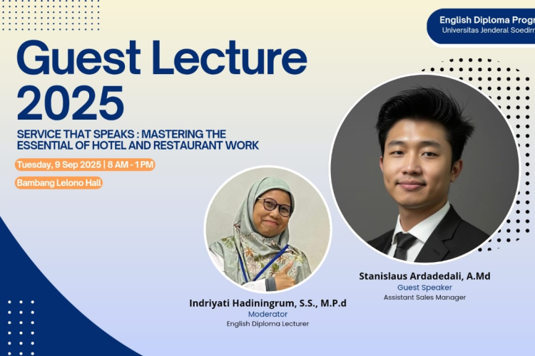 Press Release Guest Lecture : ‘’Service that Speaks: Mastering the Essentials of Hotel and Restaurant Work’’ Program studi D3 Bahasa Inggris Unsoed mengadakan kuliah dosen tamu di Aula Bambang Lelono,