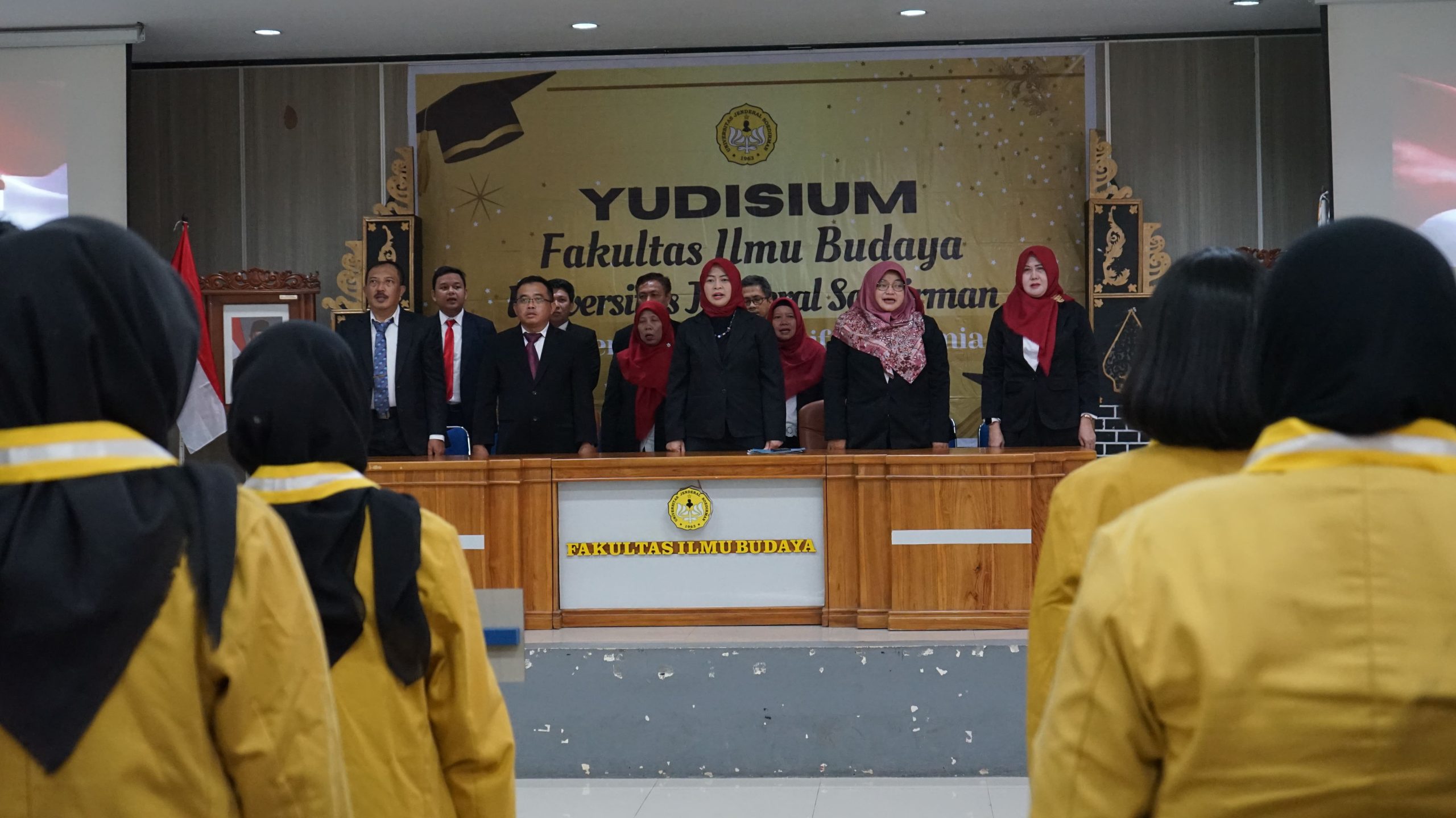 Dalam prosesi tersebut Dekan FIB Unsoed atas nama rektor Unsoed menandatangani pernyataan kelulusan dan SK Yudisium beserta lampirannya. Adapun mahasiswi calon Wisudawan/wisudawati yang mengikuti yudisium pada periode ini berjumlah 52 orang mahasiswa yaitu 8 mahasiswa S1 Sastra Inggris, 12 mahasiswa Sastra Indonesia, 8 Mahasiswa SI Sastra Jepang, 4 Mahasiswa SI Pendidikan Bahasa Indonesia, 9 Mahasiswa S1 Pendidikan Bahasa Inggris , 5 Mahasiswa D3 Bahasa Inggris  dan 6 mahasiswa Program Studi D3 Bahasa Mandarin. Lulus dengan predikat Sangat Memuaskan 52 mahasiswa, Calon Wisudawan terbaik pada Yudisium periode Ini adalah dari Program Studi SI Sastra Jepang  dengan IPK 3,93 Nama Sabrina Dewi Kirana NIM. J1C021014 Acara dilanjutkan foto bersama kemudian dilanjutkan dengan pengisian dari Tim Tracer Study dan dilanjutkan dengan Pembekalan Calon Wisudawan dengan Narasumber Annisa Fricylia Saputrie, S.S dari Operation Manager Talent Acquisition .