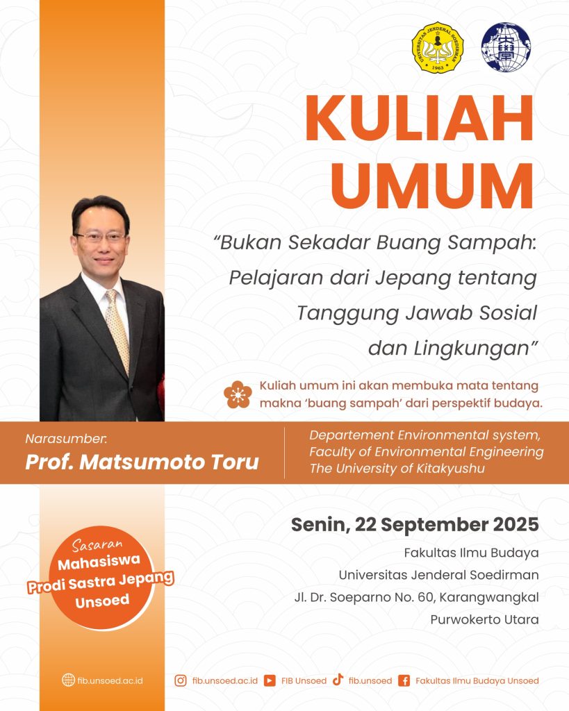 Pada Senin, 22 September 2025, Program Studi Sastra Jepang melaksanakan kegiatan kuliah dosen tamu dengan mengundang Prof. Matsumoto Toru dari Universitas Kitakyushu, Jepang. Tema yang diusung pada kuliah ini ialah mengenai “Kitakyushu Enviromental Friendy City”.